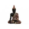 B:18 x D:10 x H:25 cm Farve: guld, sort, kork brun og rød. BEMÆRK: Farverne kan variere i forhold til billedet, da de er håndmalede. Vægt: ca 0,320 kg. Buddha 1: Den højre hånd, der er placeret på højre knæ i jordpressende mudra og suppleret med venstre hånd, som holdes fladt i skødet i meditationens dhyana mudra, symboliserer foreningen af metode og visdom, samasara og nirvana, og også realiseringen af de konventionelle og ultimative sandheder. Det er i denne kropsholdning, at Shakyamuni overvandt Maras forhindringer, mens de mediterede på Sandheden. Buddha 2: Buddha sidder med hænderne presset sammen i wai positionen som er en standard holdning af hilsen. Buddha har klæder, der dækker hans venstre skulder, der forlader hans højre skulder bar. Buddha, hvis oprindelige navn var Siddhartha Gautama, var buddhistens grundlægger, religionen og det filosofiske system, der producerede en stor kultur i hele det sydlige og østlige Asien. Buddha, der betyder "vækket" eller "oplyst" er en titel, der ikke er et navn. I hinduistisk dogma betragtes Buddha som den 9. avatar af den hinduiske gud Vishnu. Buddha var en søn af herskerne Sakyas. Han var gift i en alder af 16 år og levede i luksus og komfort beskyttet mod livets hårde virkelighed. Da han var 29, indså han, at mænd er udsat for alderdom, sygdom og død. Han blev opmærksom på den lidelse, der er forbundet med eksistensen. Han besluttede at opgive det oprigtige liv og blive en vandrende asketisk (samana) på jagt efter sandheden. Med de to sammensamlinger nåede han mystiske tilstande med forhøjet bevidsthed, men han undlod at finde sandheden. Han fortsatte sin søgning og blev tilsluttet af fem asketikere i en lund nær Uruvela, hvor han praktiserede adskillige stramninger og selvforagtelse i seks år. Da han svigtede væk i svaghed, opgav han asketiske praksis for at søge sin egen vej til Oplysning. Afskaffelse af sine samtidige læresætninger, gennem meditation opnået han oplysning eller endelig forståelse. Derefter instruerede Buddha sine tilhængere i dharmaen (sandheden) og "middelvejen" en vej mellem det verdslige liv og ekstremer af selvfornægtelse. Kendsgerningen i Buddhas tidlige prædiken blev sagt at være de fire ædle sandheder: 1) livet er fundamentalt skuffelse og lidelse. 2) lidelse er et resultat af ens lyster til glæde, magt og fortsatte eksistens; 3) for at stoppe skuffelse og lidelse må man stoppe med at ønske; og 4) vejen til at stoppe med at ønske og således lide, er den ædle otte foldige sti – rigtige synspunkter, højre hensigt, ret tale, ret handling, ret levebrød, ret indsats, korrekt bevidsthed og rigtig koncentration. Realiseringen af sandheden af anatman (intet evigt selv) blev undervist som afgørende for den ubeskrivelige tilstand af frigivelse kaldet nirvana.