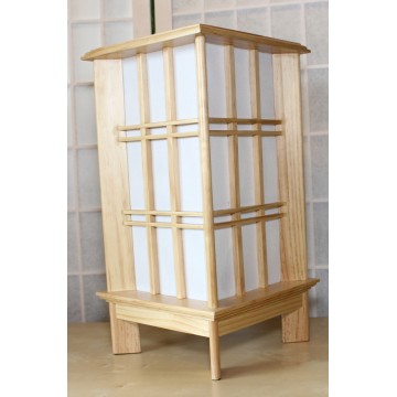 Smuk japansk lampe i naturfarvet træ og rispapir med flotte detaljer i høj kvalitet. Mål: 24 x 24 x 46 cm. Den har almindelig fatning til dansk lyspære. E 27 Max. 60 watt.