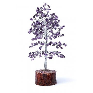 Ametyst træ i smukt design, som kan stå og pynte og sprede varme blide og harmoniserende energier i ethvet rum. Basen er lavet af neem-træ – fra et træ i mahognifamilien hjemmehørende på det indiske subkontinent. Det er kendt for både sin behagelige aroma og dets medicinske og metafysiske egenskaber, hvilket gør det til et symbol på helbredelse, beskyttelse og åndelig vækst. Ametyst kommer fra græsk ”amethustos”, som betyder ”ikke fuld”. Ametystens spirituelle kvaliteter indebærer; drømme, fred, kærlighed, mod, beskyttelse og spirituel opløftelse. Ametysten menes at kunne rense auraen og derfor inspirere et højere meditativt stadie. Ametyst siges også at være en ædelsten der vil gøre bæreren mild og elskværdig. Ametyst er en fremragende sten til meditation, en god aurarenser og anbefales også mod søvnløshed Nøgleord: Ro, balance og fred. Energier: Ametyst har en beroligende virkning, beskytter mod uønskede indflydelser og har en rensende effekt på krop og sjæl. Ametyst virker beroligende og afstressende og hæver os op mod den spirituelle eller guddommelige verden. Ametyst giver tillid og selvtillid. Den hjælper dig til at træffe de rigtige beslutninger. Beskytter mod lave energier og befordrer ægteskabelig lykke. Giver klarhed både i drømme, og når der skal træffes store beslutninger. Affirmation: "Jeg har mod og klarhed til at træffe beslutninger, som er rigtige for mig" Chakra: Det tredje øje og Krone Mål: H: 23 cm B: ca. 14 cm D: ca. 12 cm Materiale: Neem træ, sølvfarvet tråd og ametyst.
