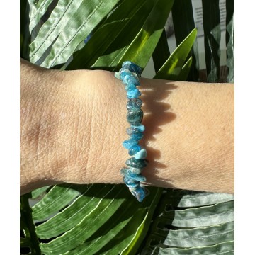 Blå apatit er en smuk blå krystal og er kendt for sine mange egenskaber. Nøgleord: Kommunikation, kreativitet og intuition. Energier: Blå apatit associeres ofte med at styrke kommunikationsevner, både verbalt og mentalt. Den kan hjælpe med at udtrykke tanker og følelser klart.Krystallen siges at støtte selvudtryk og kreativitet. Det antages at hjælpe med at overvinde usikkerhed og frygt for at udtrykke sig.Blå apatit kan bidrage til at styrke selvdisciplin og motivation. Den hjælper med at sætte mål og arbejde målrettet mod dem.Stenen siges også at kunne åbne op for åndelig bevidsthed og hjælpe med at forstærke intuition og forbindelse til de højere guider. Affirmation: "Jeg har tillid til min intuition og taler min sandhed" Chakra: Hals Krystallens str.: 0,4 – 1,2 mm. Armbåndet er lavet på en smykke elastik som gør det nemt at tage af og på. Armbåndet er ca. 16 til 19 cm/one-size.