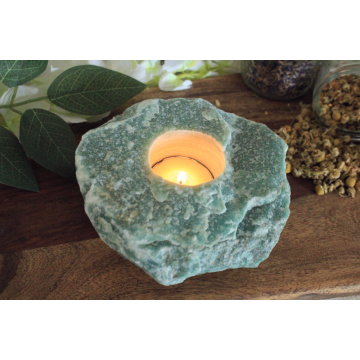 Aventurin fyrfadslysestage. Aventurin siges at bringe held, velstand og succes. Den siges også at være nyttig til at skabe forbindelse med engle og åndelige guider, hvilket gør det til en perfekt sten til meditation og åndeligt arbejde. Nøgleord:Overflod, eventyr og meditation. Energier: aventurin er en overflodssten der repræsenterer lethed, eventyr og kærlighed. Den siges at bringe held i kærlighed og pengesager, idet den stimulerer følelsen af at alt er muligt. Aventurin giver tro på livet og en tro på at tingene kommer i den rigtige rækkefølge og til rette tid. Den bliver også kaldt for eventyrstenen. Affirmation: "Jeg er skaber af min egen succes og tillader mig selv at lade livet være et langt eventyr" Chakra: Hjerte Størrelse: ca 8 – 10 cm. Kan variere i udseende da de er håndlavede.
