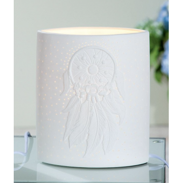 En drømmefanger er udformet som en cirkel med et net i. Cirklen i drømmefangeren siges at symbolisere livets cyklus, imens nettet imellem bruges som et "edderkoppespind" til at sortere uvelkomne drømme fra, så kun de gode og brugbare slipper igennem.Ifølge legenden blev ideen om drømmefangeren overført til indfødte indianere i Amerika i visioner. Med lampen følger en ledning med kontakt. Materiale: Porcelæn Farve: Hvid Mål: H: 20 x B: 17 x D: 9 cm Vægt: 1,00 kg