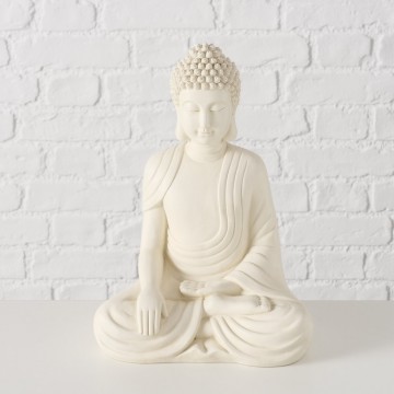 Buddha betyder den oplyste, og er en titel, som beskriver det højeste stadie, som man kan nå inden for buddhisme. Buddhisme bygger på legenden om en prins som var opvokset i luksus, der nåede et særligt højt niveau for erkendelse, og som går under navnet Sakayami Buddha. Som ung tog han ud i verden for at søge sandheden, han endte i bjergene, hvor han levede som asket i flere år. Som asket og som yoga udøvende opnåede han den store erkendelse om livets mening og blev den første Buddha.Han kaldes for den historiske Buddha og menes at være født i Nordindien ca. 560 år f.kr. Materiale: Polyresin Farve: Cremet hvid Mål: H: 30 cm x B: 22 x D: 14 cm Vægt: 860g Bemærk: Buddha er fotograferet udendørs men den er til indendørs.