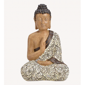 Materiale: Polyresin. Farve: Beige og brun. Mål: B: 23 x D: 19 x H: 37 Abhaya Mudra som symboliserer beskyttelse. Højre hånd er løftet, venstre hånd ligger i skødet med håndfladen opad. Denne mudra giver beskyttelse og fjerne frygt. Buddhaen er fremstillet i beige og brun træfinish med god tyngde. De forskellige håndstillinger ( mudra), man ser på Buddha statuer, har alle en dybere betydning. Denne mudra (håndstilling) symboliserer beskyttelse og fjerne frygt.