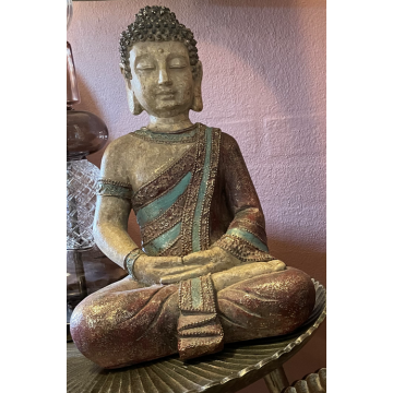 Buddha statuen viser begge hænder hviler i skødet. Bagsiden af højre hånd læner sig på venstre håndflade. Ofte rører tommelfingerne hinanden og danner den mystiske trekant. Dette er meditations mudraet, som symboliserer visdom. Buddha brugte denne gestus under sin endelige meditation under Bodhi-træet, da han opnåede oplysning. Det er også kendt som Samadhi eller Yoga mudra. Dette er den karakteristiske gestus af Buddha Shakyamuni, Dhyani Buddha Amitabh og Medicine Buddha. H: 38cm, B: 25cm, D: 19cm Materiale: Polyresin