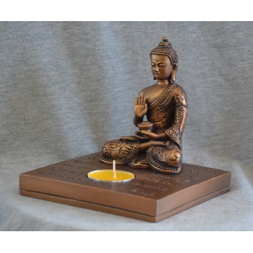 Flot Buddha statue med plads til fyrfadslys. Størrelse er for foden 12,5×13 cm, og den er 13 cm høj i alt. Denne lysestage viser en Buddha siddende på en base, der er indgraveret med en tekst fra den Buddhistiske hjerte Sutra. Gautama Buddha blev født i 563 B.C i Lumbini, Nepal. Buddha var søn af kongen af Sakyas. Suddhodanal. Hans mor var dronning Maya. Han blev opkaldt Siddhartha. Han havde fornøjelsen af at leve paladslivet. Som 16 årig blev han gift med prinsesse Yasodhara. De fik en søn ved navn Rahula. Siddhartha var udset til at blive konge, men flere oplevelser bla. mødet med en gammel mand, som var døende gjorde et stort indtryk på ham, at han valgte at blive asket. Yderligere fik oplevelsen Siddhartha til at søge sandheden. Da han er omkring de 30 år forlader han sin familie og bliver omvandrende asket. Efter flere år, hvor han udøvede alle former for bodsøvelser, nåede han til den endelige oplysning under en syv dages meditation under Bo-træet i Bodhgava. Da var han omkring 35 år. Her opnåede han erkendelse om livet som lidelse, årsagen dertil, at lidelsen kan stoppes og vejen ud af lidelse. Den erkendelse som kaldes De Fire Ædle Sandheder, og som han senere fremsætter i Benaresprædikenen. Siddhartha var blevet Buddha, og snart kom der folk, der flokkedes for at høre på hans lære og som ville følge ham på munkevejen mod egen oplysning. Buddhismen var født.