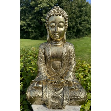 Buddha betyder den oplyste, og er en titel, som beskriver det højeste stadie, som man kan nå inden for buddhisme. Buddhisme bygger på legenden om en prins som var opvokset i luksus, der nåede et særligt højt niveau for erkendelse, og som går under navnet Sakayami Buddha. Som ung tog han ud i verden for at søge sandheden, han endte i bjergene, hvor han levede som asket i flere år. Som asket og som yoga udøvende opnåede han den store erkendelse om livets mening og blev den første Buddha.Han kaldes for den historiske Buddha og menes at være født i Nordindien ca. 560 år f.kr. Materiale: Polyresin Farve: Guld Mål: H: 39 cm x B: 24 x D: 19 cm Bemærk: Buddha er fotograferet udendørs men den er til indendørs.