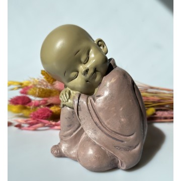 Enhver Buddha figur er inspireret af buddhismens stifter, Siddharta Gautama. Dette var en mand, der var vokset op i luksus, og i de første mange år af hans liv forlod han ikke sit fars palads. Faderen anstrengte sig for at beskytte sønnen imod livets realiteter, men til sidst blev han alligevel utilfreds med livet indenfor paladsets rammer. Siddharta besluttede sig derfor for at forlade Paladset og opleve livet udenfor dets mure. Han blev forskrækket af de syn, der mødte ham – en senil mand, en mand plaget af sygdom samt et lig omgivet af sørgende venner og slægtninge. Hver gang forklarede hans tjener ham, at det var ting, der kom til os alle med alderen.Til sidst mødte han en omvandrende helligmand. Tjeneren fortalte ham, at denne mand havde frasagt sig det almindelige liv, og søgte efter fred og enden på menneskelig lidelse. Siddharta vidste med det samme, at det var den vej, han ville vælge. Således blev han munk, og igennem 6 år levede han et liv af selvfornægtelse og streng disciplin. Hans håb var, at han på denne måde kunne få den indsigt han behøvede, for at finde enden på menneskelig lidelse. Mål: H: 12 cm B: 10 x D: 9,5 cm Materiale: Polyresin.