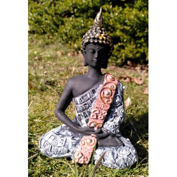 Buddha statuen viser begge hænder hviler i skødet. Bagsiden af højre hånd læner sig på venstre håndflade. Ofte rører tommelfingerne hinanden og danner den mystiske trekant. Dette er meditations mudraet, som symboliserer visdom. Buddha brugte denne gestus under sin endelige meditation under Bodhi-træet, da han opnåede oplysning. Materiale: Polyresin Farve: Blå, ferskenfarvet, guld og sort Mål: H: 19,5 B: 13 x D: 6,5 cm Vægt: 0,24 kg