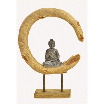 Buddha statuen i livshjul viser begge hænder hvilende i skødet. Bagsiden af højre hånd hviler sig på venstre håndflade. Ofte rører tommelfingerne hinanden og danner den mystiske trekant. Dette er meditations mudraet, som symboliserer visdom. Buddha brugte denne gestus under sin endelige meditation under Bodhi-træet. Det er også kendt som Samadhi eller Yoga mudra. Mål: H: 30 cm, B: 20 cm, D: 6 cm Vægt: 750 g Materiale: Polyresin