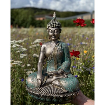 Buddha Bhumisparsa Mudra (Bhumisparsha) Bhumisparsha Buddha er altid afbildet i en siddende stilling, med højre hånd på knæ og fingre pegende mod jorden. Den venstre hånd hviler på skødet med håndfladen vendt opad. 'Bhumisparsha' betyder 'at røre jorden' eller 'kalde jorden til at vidne'. Denne mudra repræsenterer det øjeblik, da Buddha blev oplyst under Bodhi-træet. Som repræsenterer Buddhas opvågning, da han hævder jorden som vidnesbyrd om hans oplysning. Bhumisparsa mudra er en af de mest berømte håndbevægelser (mudras) i buddhistisk ikonografi, og den repræsenterer en særlig betydning inden for buddhismen. Denne gestus er forbundet med et specifikt øjeblik i Buddhas liv, hvor han opnåede oplysning under Bodhi-træet. H: 43,5 x L: 29 x B: 20,5 cm Farve: bronze/guld, turkis og grøn. Materiale: Polyresin