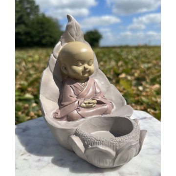 En ung Buddha i meditationsstilling med plads til en blomst, et lys eller en anden dekorativ genstand efter eget valg, som du kan placere i skålen foran. Buddha, hvis oprindelige navn var Siddhartha Gautama, var buddhismens grundlægger. Buddha, der betyder "vækket" eller "oplyst" er en titel, der ikke er et navn. I hinduistisk dogma betragtes Buddha som den 9. avatar af den hinduiske gud Vishnu. Buddha levede i luksus og komfort beskyttet mod livets hårde virkelighed. Da han var 29, indså han, at mennesker er udsat for alderdom, sygdom og død. Han blev opmærksom på den lidelse, der er forbundet med eksistensen. Han besluttede at opgive det oprigtige liv og blive en vandrende asketisk (samana) på jagt efter sandheden. Mål: H:13 cm B: 10 cm D: 12 cm Materiale: Polyresin