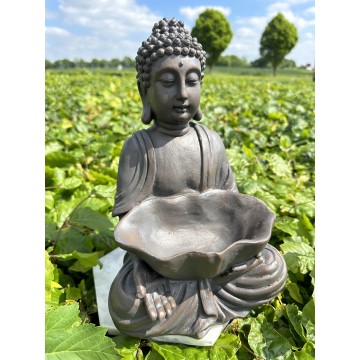 Buddha med fad. Buddha betyder den oplyste, og er en titel, som beskriver det højeste stadie, som man kan nå inden for buddhisme. Buddhisme bygger på legenden om en prins som var opvokset i luksus, der nåede et særligt højt niveau for erkendelse, og som går under navnet Sakayami Buddha. Som ung tog han ud i verden for at søge sandheden, han endte i bjergene, hvor han levede som asket i flere år. Som asket og som yoga udøvende opnåede han den store erkendelse om livets mening og blev den første Buddha.Han kaldes for den historiske Buddha og menes at være født i Nordindien ca. 560 år f.kr. Mål: B: 20 D: 17 H: 30 cm Farve: Brun. Materiale: Polyresin.