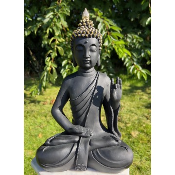 Forestil dig at have en Buddha-figur med forklaringens gestus i dit hjem eller arbejdsrum – ikke blot som et dekorativt element, men som et symbol på visdom og indre balance. Denne specielle håndstilling, hvor tommelfinger og pegefinger mødes, repræsenterer Buddhas dybe engagement i undervisning og dialog. Det er en gestus, der udtrykker den fredelige formidling af sandhed og indsigt. En Buddha med forklaringens gestus minder os om, at vi hele tiden lærer og udvikler os. Den opfordrer til refleksion og åbenhed for nye ideer, uanset om det er i vores personlige liv, karriere eller åndelige rejse. Ved at placere denne figur i dit rum får du ikke blot et kunstværk, men et dagligt symbol på harmoni, læring og mental klarhed. Denne mudra repræsenterer diskussion, undervisning og formidling af buddhistisk lære. Det bruges til at illustrere Buddhas intellektuelle debat og hans undervisning i dharma (den buddhistiske lære). Mål: H: 30 x B: 17 x D: 12 cm Materiale: Polyresin. Farve: Sort – Guld på hår.