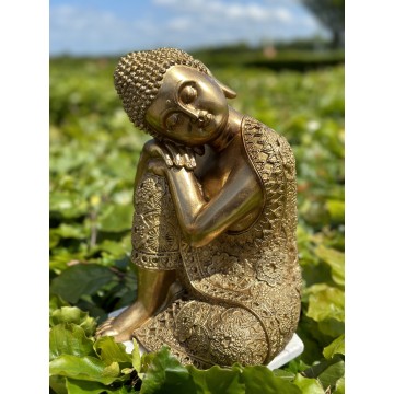 Buddhaen er klædt i et meget smukt og detaljeret klæde. Mål: H: 31 x B: 21 x D: 22 cm. Vægt: 1,41 kg Materiale: Gylden polyresin Farve: Guld