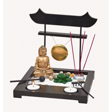 Smuk indendørs Buddha Zen garden i mørke brun, med en fin mediterende Buddha der sidder i haven. I det andet hjørne er der en blomst, foran er der to huller hvor du evt kan sætte fyrfadslys i. En lille japansk have med sand og en lille rive, skøn zen have. Sættet indeholder: En træ rive, sten, sand, Buddha figur, lille røgelses holder, grøn "blomst", kølle og dong dong. Med andre ord alt hvad du ser på billedet medfølger. Mål: 22 x 22 x 22 cm