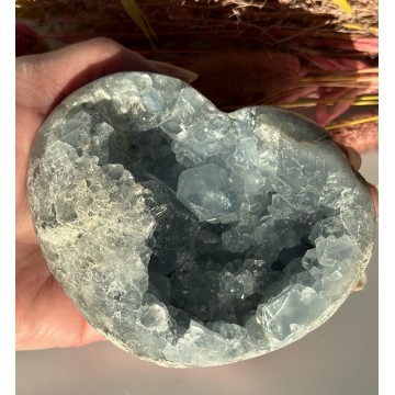 UNIKA: den du ser på billedet er den du får. Celestit er kendt som en englesten med beroligende og opløftende energier. Den bringer en dejlig vished og følelse af at være beskyttet af englenes og åndelige vejlederes kærlige energier og livskraft. Nøgleord:Guddommelighed, åndelighed og styrke. Energier:Celestit er en krystalinsk form af strontiumsulfat og har en karakteristisk blå farve, hvilket kan forbindes med himlen og de guddommelige energier samt repræsentere åndelighed, fred og guddommelig kærlighed.En fantastisk krystal til at åbne eller forstærke forbindelsen til højere bevidsthed. En sten, der på kærligste vis støtter energien under meditation, bøn og åndelige praksisser.Celestit virker beroligende og knyttes ofte til at lette kommunikationen, især den der handler om at udtrykke følelser og tanker. Celestit hjælper os i en særlig grad med at åbne kommunikationskanaler og fremme et ærligt og autentisk udtryk. Affirmation: "Jeg er 100 % støttet af den guddommelige energi der strømmer igennem mig." Chakra: Hals og krone Mål: H:5,3 cm, B: 10 cm, D: 8 cm Vægt: 648 g Vores sten og krystaller er af højeste kvalitet, da alle bliver nøje udvalgt. Men ikke ens, så der kan forekomme forskelle i udseende, størrelse og ujævnheder.