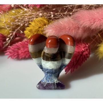 Håndskåret chakra engel. Engle er budbringere fra de højere verdener, klar til at give os følelsesmæssig tillid og åndelig vejledning. Disse udskårne engle hjælper os med at forbinde os til vores værtsengel, som vil bestytte os i alt hvad vi beder om. Hver engel er udskåret af de forskellige krystaller og har hver sit unikke mønster og farve. Denne smukke englefigur er sat sammen af følgende syv krystaller: AmetystBlå kvartsSodalitAventurinTigerøjeFersken AventurinRød Jaspis Mål: H: 4 cm, b: 3cm, d: 1,5 cm Vores sten og krystaller er af højeste kvalitet, da alle bliver nøje udvalgt. Men er ikke ens, så der kan forekomme forskelle i udseende, størrelse og ujævnheder.