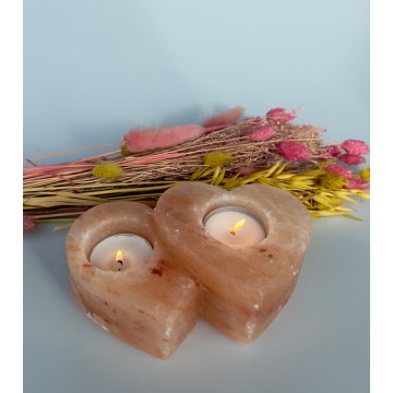 Saltkrystal fyrfadsstage i en smuk dobbelthjerte form. Fyrfadslysene sidder så dybt i stenen at man ikke kan se selve fyrfadslysene. Det giver et rigtig flot skær igennem stenen. Lyset giver en god atmosfære i rummet og minder os om solens varme stråler, gløden i det harmoniske og orange lys. For foden af Himalayabjergene ligger disse smukke saltaflejringer. De stammer fra et meget gammelt hav, der fordampede for 250 millioner år siden. Saltaflejringerne er med landskabets bevægelse løftet op i bjergene, hvor det ligger 500 meter under jorden. Lysestagen er et naturprodukt, derfor kan farve og udseende variere lidt. Mål: H: 5,5 – 6 B: 16 D: 10 cm Vægt: 1,1 kg