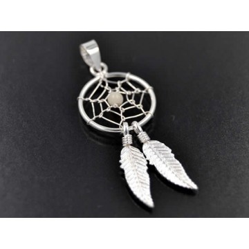 Drømmefanger vedhæng i sterlin sølv med hvid perle i midten. Ifølge indiansk tradition fanger drømmefangeren alle drømme i sit net. Perlen eller stenen i midten af drømmefangeren, repræsenterer det punkt hvor dit drømmetotem sidder og passer på, her indfanges de onde drømme, mareridt og negative ting sendt fra andre og kun de gode ting sendes videre. Smykker – det sidste pift, som fuldender din stil og udstråling. Med disse arketypiske spirituelle symboler sender du et signal, som både giver genklang i dit indre og i dine omgivelser. Længde: 33 mm Bredde: 14 mm