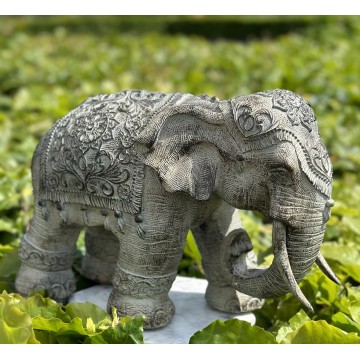 Mål: B: 38 x H: 27 x D: 18 cm Materiale: Polyesin Farve: grå / beige Elefanten er et symbol på royalty og frugtbarhed. Som det største pattedyr på landjorden, vækker elefanterne ærefrygt og undren; og sand åndelig retfærdighed vil gøre det samme, når vi ser det på spil i vores liv. Elefanter er uhyre omsorgsfuld og giver pleje til hinanden. De viser stor styrke og sammenhold, de sørger over dem, der er ved at dø. Deres følelsesregister er lig med vores egen, men de viser dem lettere og mere naturligt. En af de mest fremragende karakteristika hos elefanten er snablen. Selv om den har relativt dårligt syn, har den en skarp lugtesans. Den snuser duftstoffer op i snablen og opfanger meget om, hvad der sker omkring den. For dem der har kontakt med elefanten vil det være klogt ikke kun at stole på, hvad de ser, men hvad der lugter rigtigt- især når vigtige beslutninger skal tages. Både alder og køn, hver med specifikke roller, opdeler elefanternes samfund. Køer og kalve lever sammen, ledet af en klog gammel ko. Dette afspejler den gamle tradition af de tre udtryk for feminine energier – barn, mor og klog ældre. Mandlige elefanter lever i ungkarle besætninger. Mange samfund eksisterede, hvor der var hellige lærdomme og roller efter køn for det kreative liv i hele samfundet. Elefanter udviser stor loyalitet og hengivenhed til hinanden. Ældre kalve tage sig af yngre søskende. Voksne elefanter hjælpe de syge og sårede. I elefanten er idealerne om det sande samfund.