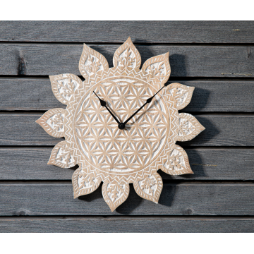 Flower of life ur Et ekstraordinært væg ur lavet af mangotræ med en håndskåret livsblomst. Dette er indrammet af tolv lotusblade – et blad for hver time. Fin indisk udskæring med batteri urværk. Kræver et AA-batteri (medfølger ikke). Material: Mangotræ, D: 38 cm