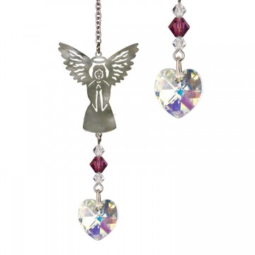 Håndlavet skytengel ophæng. Birthstone Engel solfanger er med klare og en ametyst farvet krystal, den perfekte gave til en fødselar i Februar. En spejlfinish metal engel fremhæves med fødselstenskrystaller, hvilket fører til et Swarovski hjerte. Hver engel kommer på et kort med en forklaring af dets farvebetydning.( På engelsk ) Følelse: Spiritualitet, klarhed, ro. Alle fødselsstens engle er håndlavede; derfor kan størrelser variere. Ophænget ialt: 22 cm. Engel: 35 x 34 mm. Hjerte: 14 x 14 x 8 mm På engelsk: Each Angel comes on a card with an explanation of it's colour meaning.