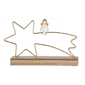 En sød lille engel på et stjerneskud lavet i metal og med lys i. Stjerne er på en fin fod lavet i træ. Flere teologer mener, at englene blev skabt som de første, samtidig med lyset og før menneskene. Gud skabte dem som ren ånd og uden fysisk legeme, med intelligens og vilje. Hvert menneske har en engel ved sin side som vejleder og som hyrde, der skal føre det til frelse. Det siges at du kan bede englene om hjælp til alt. Der er ingen grænser for hvad du kan spørge om. Englene kontakter dig på en måde, så du kan forstå deres budskaber. De tilpasser sig dig, hvor du er. Har du blot et åbent sind, så kan englene give dig svar, blot på en anden måde end du umiddelbart forventer det. De hører dig altid og svarer altid dine bønner. Mål: Bredde: 27 cm, højde: 18 cm, dybde: 5 cm. Vægt: Ca. 180 g. Materiale: Træ og polyresin.