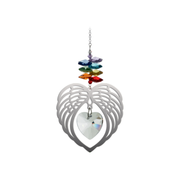 Dette hjerte repræsentere: ”Vi er hver af os engle med kun en vinge, og vi kan flyve ved at omfavne hinanden”, Luciano De Crescenzo. Håndlavet i England, Pure Radiant Crystal Fantasy i Angel Wing Heart-design, er den perfekte gave ide. En spejlfinish, metalmotiv er ophængt fra en Swarovski-krystalkaskade i Chakra-farve og omfatter et strålende klart 28 mm Swarovski-hjertevedhæng for maksimale virkninger af regnbuen. Hver solfanger leveres med en forklaring på dets betydning.( På engelsk ) Mål: Materiale: Krystal og metal.