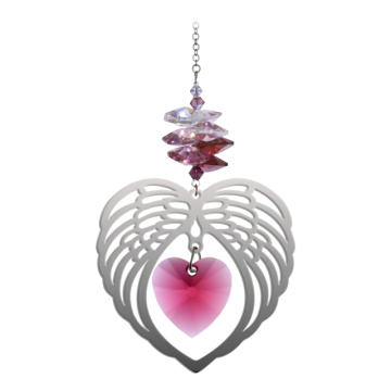 Dette hjerte repræsentere: ”Vi er hver af os engle med kun en vinge, og vi kan flyve ved at omfavne hinanden”, Luciano De Crescenzo. 'We are each of us Angels with only one wing, and we can fly by embracing one another', Luciano De Crescenzo. Håndlavet i England, Pure Radiant Crystal Fantasy i Angel Wing Heart-design, er den perfekte gave ide. En spejlfinish, metalmotiv er ophængt fra en Swarovski-krystalkaskade i Ruby farver og omfatter et strålende klart 28 mm Swarovski-hjertevedhæng for maksimale virkninger af regnbuen. Hver solfanger leveres med en forklaring på dets betydning.( På engelsk ) Mål: 6,5 x 7 cm hjerte Mål i hel længde: ca 20 cm. Materiale: Krystal og metal.
