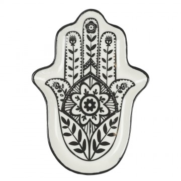 Fatimas hånd har navn efter profeten Muhammeds datter Fatima. I islamisk sammenhæng kan de fem fingre symbolisere fx islams fem søjler, den hellige familie eller de fem daglige bønner, i jødisk sammenhæng bl. a. Bibelens fem Mosebøger. Det stærke symbol "Fatimas hånd", symbolet står for at bringe lykke og sundhed. Der er tale om en såkaldt folkelig praksis. Fatimas hånd kaldes også Khamsa på arabisk, hvilket betyder fem. Betegnelsen Khamsa hentyder således til symbolets form, som er en hånd med fem fingre. Hænder er et guddommeligt redskab til overførsel af universelle helbredende kræfter. Farve: Sand og sort Materialer: Keramik Mål: H: 1,5 B: 11 cm L: 16 cm