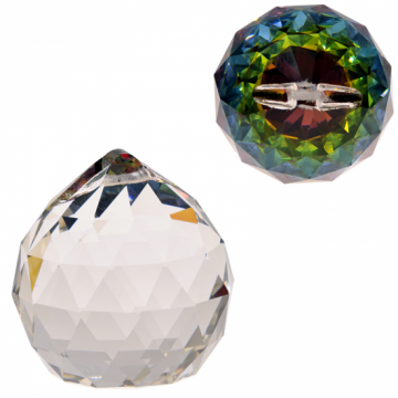 Prisme kugle 5 cm. Krystal Sphere multicolor AAA Quality. Der er et spejl i bunden af denne krystal, det gør at den kan sprede lyset endnu mere. Feng shui kunsten handler om at leve i harmoni med vores omgivelser. Det er en gammel filosofi, der stammer fra Kina for mere end 3500 år siden. Dengang blev det primært brugt til at indrette og organisere vigtige og spirituelle bygninger. Formålet er at stimulere tilstrømningen af positive energier i et rum. Idag er Feng Shui ikke kun anvendt i de østlige kulturer, det er også populært i Vesten. Lad dig tiltrække af krystallernes unikke skønhed og kvaliteter. Udover at tilføje en beskyttende energi i dit hjem, så er de også et fantastisk og dekorativt statement. Luk regnbuerne ind i dit hjem. Hæng prismen i sin snor i et vindue med sol. Når solen skinner på den, spreder den de smukkeste regnbuer i dit hjem. Feng shui bruger krystaller der hænger i en snor, til at tiltrække chi (energi) udefra ind i mørke eller dystre områder i huset – Når sollyset rammer krystallen, fyldes rummet med regnbuens farver og sender lys i alle retninger – herved brydes forvirrende og uønsket chi (energi) Krystallerne er meget dekorative og flotte at have i sit hjem.