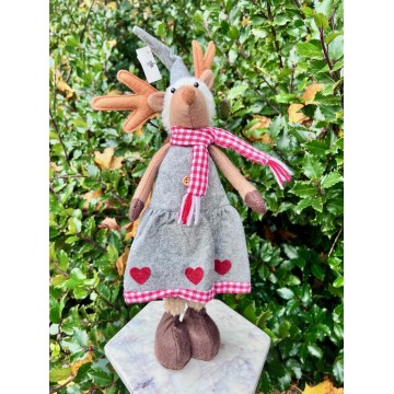 Hun passer perfekt ind i både klassiske og moderne juledekorationer, hvad enten hun står alene eller sammen med andre julefigurer. Placer hende i stuen, på reolen eller som en skøn detalje på julebordet, og lad hende sprede glæde og hygge hele december. Fru Elg i grå er den perfekte tilføjelse for dig, der ønsker en dekorativ figur med personlighed, der kan få enhver til at smile! Mål: H: 40cm x B: 15 cm Materiale: Plastik, bomuld, metal Vægt: 120 g. Farve: hvid, brun, grå