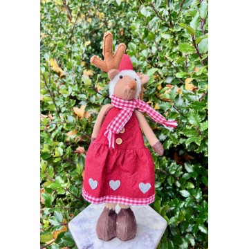 Hun passer perfekt ind i både klassiske og moderne juledekorationer, hvad enten hun står alene eller sammen med andre julefigurer. Placer hende i stuen, på reolen eller som en skøn detalje på julebordet, og lad hende sprede glæde og hygge hele december. Fru Elg i rød er den perfekte tilføjelse for dig, der ønsker en dekorativ figur med personlighed, der kan få enhver til at smile! Mål: H: 40cm x B: 15 cm Materiale: Plastik, bomuld, metal Vægt: 120 g. Farve: Rød, hvid, brun, grå