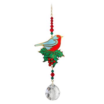 Dette smukke ophæng er håndlavet.Et spejlfinish fugle motiv i metal, som hænger mellem et matchende perleforløb og krystalkaskade i røde og grønne farver, der indeholder krystaller af høj kvalitet. Ophænget afsluttes med en strålende klar krystal kugle for maksimale farveglans og sollys effekter af fuglen.Når sollyset rammer ophænget stråler de smukkeste farver og mønstre ud i rummet og fortryller enhver der kommer forbi. Skab gode energier og høj æstetik med dette smukke krystal ophæng i hjemmet, på kontoret eller hvor du har brug for høje og positive energier og vibrationer. Motiv: 5 x 4 cm. Krystal: 2 x 2 cm Længde inkl. kæde:17 cm. Guld farvet kæde.