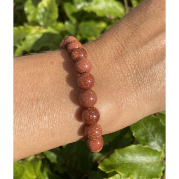 Goldstone (sandsten) perlen oplader dine energifelter, så alting er sjovere og aldrig kedeligt. Den beroligerer, samt giver en energisk og entusiastisk fremtoning. Den fjerner negative tanker og energier. Den giver selvtillid og tro på egne evner. Goldstone skaber ro på en måde, at du omgiver dig med gode mennesker med positive indstillinger. Hjælper på din personlige udvikling, samt øger livsgløden i dit indre jeg. Armbåndet er lavet på en smykke elastik som gør det nemt at tage af og på. Armbåndet er ca. 17 til 19 cm/one-size. Krystallens størrelse: 8 mm Chakra: Hjerte og krone.