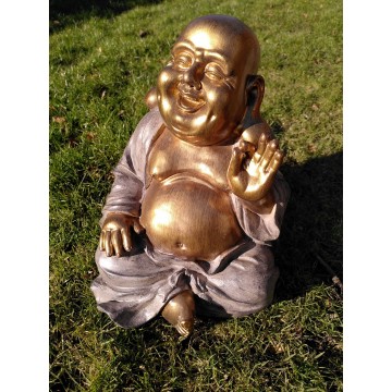 Tænk at bringe positiv Feng Shui i hjemmet eller i forretningen. En unik og særpræget gaveide. Den glade Buddha statue antages at bringe glade, kærlige, positive holdninger til dit hjem eller kontoret. Med et sådant smidtsomt smil er denne statue sikker på at inspirere til lykke og glæde rundt om i dit hjem. Materiale. polyresin Farve: Gylden og grå/mørke klæder Mål: H: 32 x B: 25 x D: 36 cm Vægt: 1,84 kg