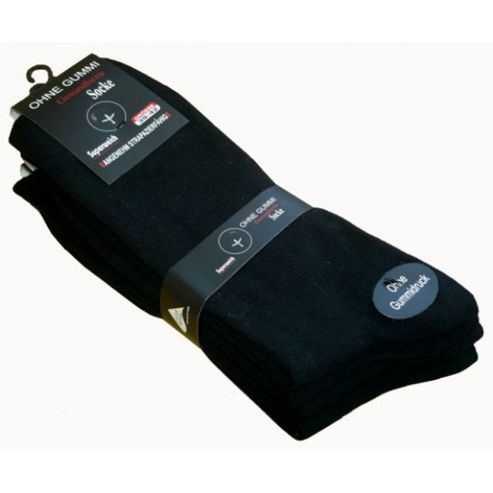 sorte herre sundheds strømper uden elastisk i linning. Diskret såmærket COMFORT-bogstaver. Materiale sammensætning: 80% bomuld, 15% polyamid, 5% spandex. Størelser 39-42 og 43-46