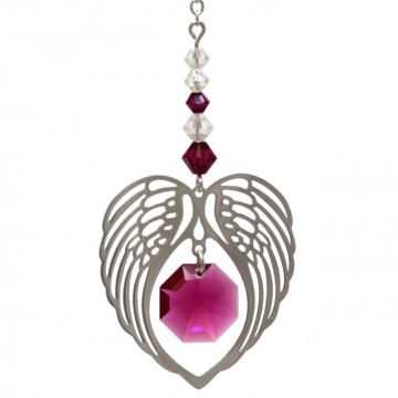 Juli Hjerte. Dette hjerte repræsentere: Hjerte, lidenskab, adel. Håndlavet i England, vores Birthstone Angel Wing Heart-solfanger i Ruby, er den perfekte gave til en fødselsdag i juli. Et spejlfinish metalvingehjertemotiv fremhæves med fødselstenskrystaller og omfatter en Swarovski ottekantet krystal. Hver solfanger leveres med en forklaring på dets farvebetydning ( På engelsk ). Mål Hjerte: 3,5 x 4 cm Mål længde ca. da de tit laver det om da de er håndlavede: 16,5 cm Materiale: Krystal og metal.