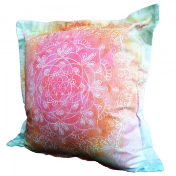 Hovedpude betræk "Rainbow" Mål På hovedpude betræk: 60 X 63 cm ALM. DANSK MÅL. Smuk hovedpude som virkelig befordrer, at man går glad i seng og vågner op i godt humør. Puden er fremstillet at blød og kraftig økologisk bomuld med mikrofin rosenkvarts i farverne, og stoffet er farvet med en særlig digetal teknik – helt uden vandforbrug. De spirituelle mønstre inkluderer bl.a. Livets Blomst, og "bagsiden" er faktisk også smuk og lidt mere rolig i udtrykket. Så kan du vælge efter hvad humør du er i. Takket være deres fine kvalitet og det fantasifulde look er det lige så sjovt at gå i seng som at stå op. 100% økologisk bomuld, farvet uden vandforbrug og vitaliseret med mikrofin rosenkvarts. Fine hellige symboler i mønstret. Lidt om The Spirit of OM: Vitaliseret med mikro-krystaller. Ayurvediske farvetoner – Feng Shui til at have på. The Spirit of OM er certificeret økologisk tøj af den bedste kvalitet. Håndplukket, GOTS certificeret økologisk bomuld. Miljøvenlig, bæredygtig produktion under fair og gode arbejdsforhold. Nogle modeller indeholder bambus for øget lethed og komfort. En ganske særlig og unik fordel ved Spirit of OM tøjet er at farverne i tøjet er vitaliseret med pulverriserede krystaller – som f.eks. rosenkvarts, turmalin eller ametyst. Det giver en helt utrolig opløftende og berigende virkning. Krystallerne giver på samme tid en indre ro og en højere energi. Både den aura og dine chakraer elsker at du går med tøj fra The Spirit of OM! Der er også en rigtig god energi i tøjet. Hele produktionsmetoden er baseret på Feng Shui-principper, og både skjult og synligt er der positive symboler i tekstilerne: Flower of life, Lotus, positive bekræftelser, chakrasymboler, ayurvedisk afbalancerende energi-mønstre, osv. Håndklæder og badekåber har krystaller syet ind i sømme. Farvetoner og mønstre i tøjet er afstemt efter Ayuerdiske principper, så de virker harmoniserende på alle tre Doshaer (Vata, Pita og Kapha). Det gør at farverne faktisk klæder de fleste mennesker. The Spirit of OM er økologisk tøj i høj kvalitet og i en tidløs stil, som er fremstillet til at holde i mange år. Der kommer hele tiden nye modeller til, og der er altid mange kombinationsmuligheder. Den økologiske bomuld er dyrket i Grækenland og i Tyrkiet, i områder hvor der naturligt falder en passende mængde regn, så der er næsten ikke brug for kunstvanding. For at fremstille en konvertionelt dyrket bomulds T-shirt forbruger man 2500 liter vand per T-shirt. En almindelig økologisk T-shirt koster 750 liter vand. Spirit of OM anvender praktisk talt ingen vand i sin økologiske produktion. Dertil har Spirit of OM udviklet en unik digitaltryk til bomuldsstof. Det bruger ingen vand og meget mindre farve i processen. Vitalitet og velvære. Læs meget mere om Spirit of Om her: