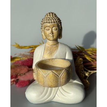 Lotusblomst: Buddha ses ofte siddende eller stående på en lotusblomst, hvilket symboliserer renhed, åndelig opvågnen og skønhed, da lotus vokser ud af mudder, men forbliver uberørt. Lyset og Opvågnen: Buddha betyder "oplyst" eller "den opvågnede", og hans billede symboliserer oplysningens lys, der bringer visdom og frihed fra lidelse. Materiale: Polyresin Farve: Hvid og lys brun. Mål: H: 25 cm x B: 20 x D: 16 cm
