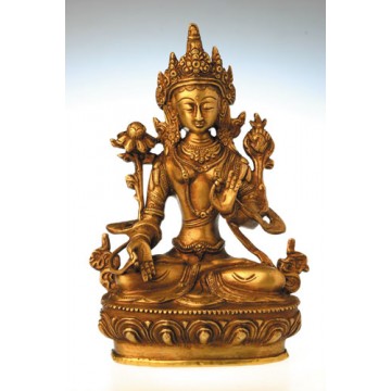 Tibetansk hvid Tara Hvid Tara (Chittamani Tara) er en kvindelig manifestation af oplyst energi, meget populær i tibetansk buddhisme. Der er 21 manifestationer af Tara; de vigtigste er hvid Tara og grøn Tara. Typisk for hendes manifestation er de syv øjne i hoved, håndflader og såler, og hun sidder i en perfekt lotusposition. I sin venstre hånd holder hun stammen af en blå lotus. Hver måned reciteres de 21 vers af Grøn Tara i alle buddhistiske åndelige samfund for at stille og overvinde forhindringer. Hvid tara har en helbredende virkning på sygdomme i krop og sind.. Tara er kendt i Tibet som “hende der frigør” altså det kvindelige aspekt af det guddommelige, der har et frigørende potentiale. En medfølende boddhisattva som frigør fra frygt og beskytter. Der er 21 aspekter af dette feminine aspekt, og den hvide er kendt for medfølelse, lang levetid, healing og sindsro. Hun siges at stamme fra Chenrizys tårer, da han brast i gråd over verdens elendighed. Tara opstod af tårerne for at hjælpe. Hun vil være på jorden og i universet, indtil alle levende væsner er oplyste. Materiale: Messing Højde: 20 cm. Bredde: 14 cm Dybde: 10 cm Vægt: Ca. 1,8 kg.