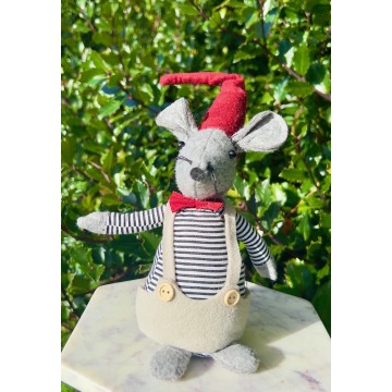 Midt i julepynten står en lille, festlig julemus, klar til at sprede varme og glæde i hjemmet. Den er lavet i blødt stof og er iklædt de fineste små smækbukser, som om den er klar til at tage del i alle julens eventyr. Om halsen har den et lille tørklæde, der snor sig blødt og hyggeligt, og på de søde, store ører sidder varme ørevarmere – helt perfekt til at holde vinterkulden væk. Musens bund er fyldt med sand, så den står solidt på bordet, altid parat til at holde øje med juleforberedelserne. Med sin nuttede charme og vinterklædte look er denne julemus som skabt til at bringe smil og hygge, uanset hvor den står. Mål: H: 19 cm x B: 6 cm x D: 10 cm Materiale: Stof, strik Vægt: 321 g. Farve: Rød, sort, hvid, grå, ternet, stribet. Prisen er pr. stk