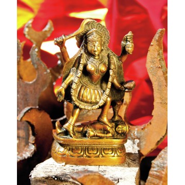 Kali symboliserer ødelæggelsen af egoet. Hun er den guddommelige moder, hvis essens er guddommelig kærlighed. I denne figur har hun som hun ofte er afbilledet et afhugget hoved i den ene hånd og flere i en kæde rundt om halsen. De afhuggede hoveder symboliserer egodød. Kali gør op med alt det vi ikke har brug for, såsom vores egos sabotage og ondskab. Den hinduistiske gudinde Kali er det ultimative udtryk for naturen, både destruktiv og velvillig. Hun beskytter sit folk mod det onde ved at gøre, hvad andre ikke kan for at beskytte dem, hun elsker. Den indiske gudinde Kali legemliggør skabelses- og ødelæggelseskraften i én enhed. Hun overgår godt og ondt. Kali er Moder Natur, plejer, skaber og fortærer på én gang, og beskytter altid sine børn mod skade. Kali er som dødsgudinde, skræmmende og fantastisk. Samtidig er hun den mest medfølende af det hinduistiske pantheon, der har til opgave at befri mennesker og hendes medguder fra det, der binder dem, og beskytte dem mod det, der ville skade dem. Mens hendes ødelæggende kraft er enorm, skader hun aldrig de uskyldige, og hendes ødelæggelse giver mulighed for genfødsel. Materiale: Messing Mål: H: 15 cm B: 9 cm D: 4,5 cm Vægt: 1100 g