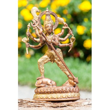 Kali symboliserer ødelæggelsen af egoet. Hun er den guddommelige moder, hvis essens er guddommelig kærlighed. Den hinduistiske gudinde Kali er det ultimative udtryk for naturen, både destruktiv og velvillig. Hun beskytter sit folk mod det onde ved at gøre, hvad andre ikke kan for at beskytte dem, hun elsker. Den indiske gudinde Kali legemliggør skabelses- og ødelæggelseskraften i én enhed. Hun overgår godt og ondt. Kali er Moder Natur, plejer, skaber og fortærer på én gang, og beskytter altid sine børn mod skade. Kali er som dødsgudinde, skræmmende og fantastisk. Samtidig er hun den mest medfølende af det hinduistiske pantheon, der har til opgave at befri mennesker og hendes medguder fra det, der binder dem, og beskytte dem mod det, der ville skade dem. Mens hendes ødelæggende kraft er enorm, skader hun aldrig de uskyldige, og hendes ødelæggelse giver mulighed for genfødsel. Materiale: Kobberbelagt messing Mål: H: 19,5 cm B: 11 cm D: 4 cm Vægt: 1 kg