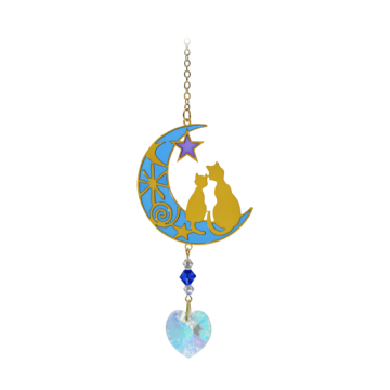 Dette smukke ophæng er håndlavet. Et spejlfinish motiv i metal, af to søde katte siddende i månens skær i smukke blå og lilla farver. Motivet hænger i en gylden kæde, der afsluttes med et strålende klart krystalhjerte for maksimale farveglans og sollys effekter af motivet.Når sollyset rammer ophænget stråler de smukkeste farver og mønstre ud i rummet og fortryller enhver der kommer forbi. Skab kærlige energier og høj æstetik med dette smukke krystal ophæng i hjemmet, på kontoret eller hvor du har brug for høje og rolige energier og vibrationer. Mål: Motiv: 4 x 4 cm. Krystalhjerte: 1,5 x 1,5 cm Længde på kæde:18 cm .
