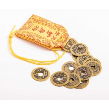 Sæt med 12 løse mønter i en fin lille gul bomuldspose. Du kan lægge dem enkeltvis, fx i din pung for at øge dit pengeflow, eller kreativt binde dem sammen til det ønskede antal. Også populær som talisman i en jakkelomme, i bilen eller som halskæde. Mønten har længe været det klassiske symbol for at øge lykke og velstand i Kina. En enkelt mønt repræsenterer dette aspekt som helhed. Et flettet bånd af mønter giver os et meget flot symbol på, hvor forbundet og sammenflettede vi er med skæbne og genstande i denne verden. Et samspil, der inviterer os til at tænke over vores fokus og mentale velbefindende. Mønternes flettede bånd har også til formål symbolsk at forbinde rigdom med vores skæbne. Mål: Mønt: Ø 2,3 cm Pose: 6 x 5 cm