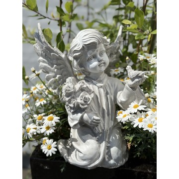 Knælende engel med blomster og fugl – Engle figurer – GodKarmaShop