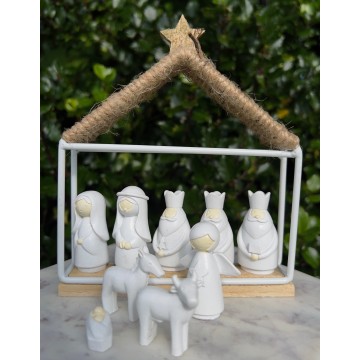 Hver figur er omhyggeligt udformet med fine detaljer, der skaber en visuel fortælling om et øjeblik af dyb betydning. Fra den beskyttende Josef og kærlige Maria til de vise mænd og de symbolske dyr, der omringer scenen, udtrykker hver figur sin rolle med stor præcision og skønhed. Dette krybbespil er en fantastisk måde at tilføre din indretning et strejf af historie og betydning, uanset årstiden. Det er en tidløs udsmykning, der ikke blot fortæller en historie, men også skaber refleksion og inspiration hos alle, der ser det. Perfekt som gave eller som en smuk tilføjelse til dit hjem, vil disse 10 figurer være et varigt og inspirerende element i enhver samling. Mål: Huset måler: H: 18,2 cm. B: 18 cm. Figurene måler mellem: 2-6 cm. Farver: Hvid, hudfarve Vægt: 381 g. Materiale: Polyresin, jern, træ
