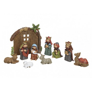 Stort krybbespil med 10 løse figurer, så du kan sætte krybbespillet op som du ønsker det. Glade figurer. En julekrybbe er en opstilling,der med figurer viser Josef, Maria, Jesusbarnet, De tre vise mænd og en fårehyrde i Bethlehem, hvor Jesusbarnet ifølge traditionen blev født. Julekrybber bliver ofte indrettet i juletiden. Den julekrybbe, som sættes op på Peterspladsen foran Peterskirken, har figurer i naturtro størrelse. Sættet består af figurerne: Josef, Maria med jesusbarnet, De tre vise mænd, et hus fladt, et får, en kamel, et æsel og en ko. Figurerne er: 3 – 17 cm høje. Materiale: polyresin.